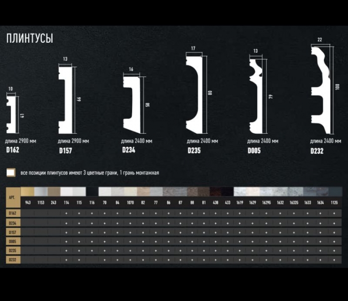 Размер: 66x13x2900мм финишное покрытие Производитель: Decomaster Материал : Дюрополимер Цена: 33.80 руб/шт 11.66 руб/м Артикул: D157-115 В корзину Ударопрочный влагостойкий плинтус с финишным покрытием (белый полуматовый), не нуждается в покраске. Выпускается с разными вариантами финишного покрытия.