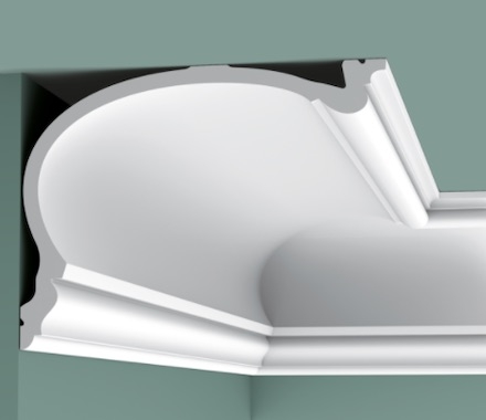 Благодаря дополнительной монтажной площадке этот карниз позволяет спрятать за него крепление штор (карниз для штор рельсового типа, беговой карниз), скрытую подсветку.